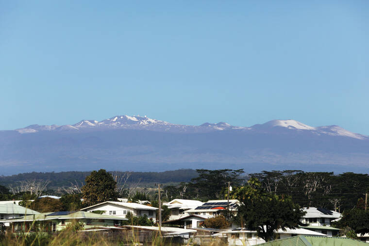 Kelsey Walling/Tribune-Herald Snow tops the summit of Maunakea on Wednesday in this view from Hilo. Clear views like this could be rare over the next few days as heavy rainfall is predicted through the weekend.