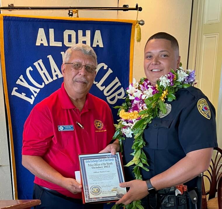 For his efforts to solve a burglary in Pahoa, Officer Taylor Cruz was honored as Officer of the Month for October 2022 by the Aloha Exchange Club of East Hawaii during a ceremony last month in Hilo.