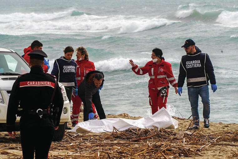 Italian authorities rejected criticism of a delayed rescue, noting they had dispatched two rescue boats shortly after the European Union’s border agency spotted the 20-foot (6-meter) boat Saturday night as it headed toward shore. The rescuers had to turn back because of the rough seas, the authorities said.