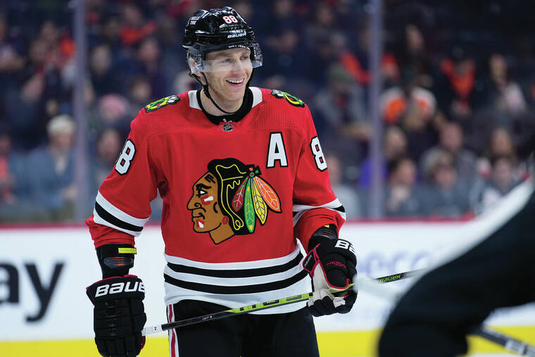 FILE - Chicago Blackhawks' Patrick Kane smiles during an NHL hockey game Jan. 19, 2023, in Philadelphia. The New York Rangers have acquired Kane in a trade with the Blackhawks. The Rangers sent a conditional second-round pick and a future fourth-rounder to Chicago and a third-rounder in 2025 to Arizona to complete the deal. Kane joins the Rangers after waiving his no-movement clause to leave the only NHL organization he has known. (AP Photo/Matt Slocum, File)