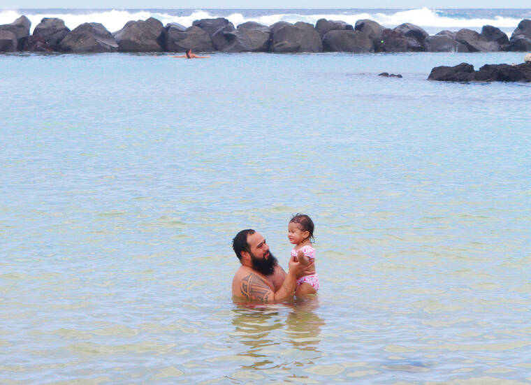 Kelsey Walling/Tribune-Herald Li Jack and Eliana swim together in Onekahakaha Beach Park on Thursday in Keaukaha.