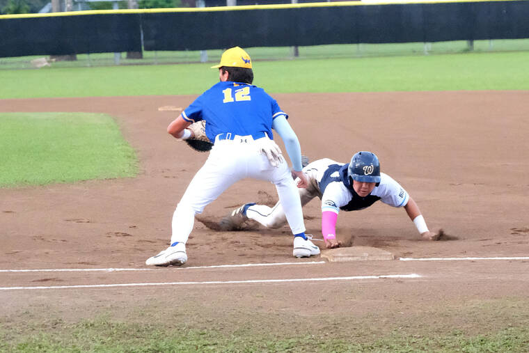 Kaleb Wada (right) dives back onto first base before first-baseman Dylan Villanueva can tag him.