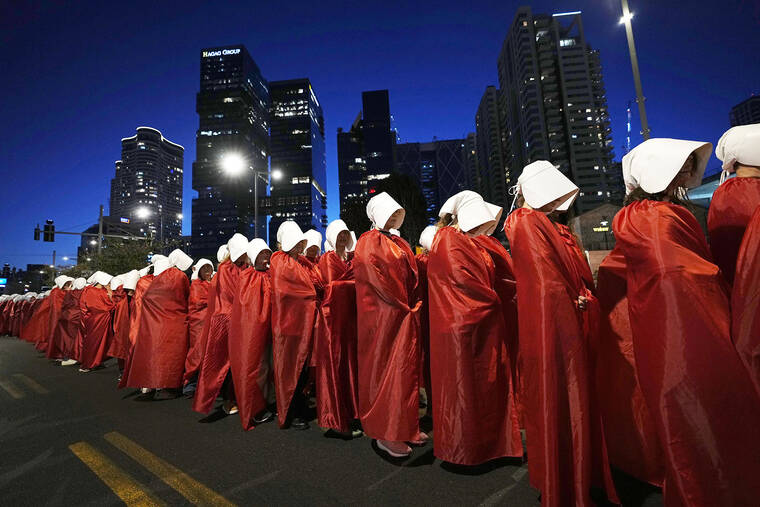 The costume, which has come to embody globally the threat to women under the patriarchy, has been used in protests elsewhere. American women opposing former President Donald Trump’s conservative Supreme Court nominees have donned the garb, as have Iranian women demonstrating in Britain in support of the protests in Iran, and Polish women calling to preserve abortion rights.