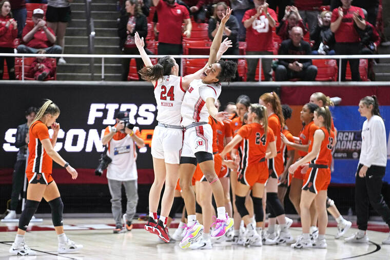 Utah's Kennady McQueen (24) and Lani White, right, celebrate following the team's win over Princeton in a second-round college basketball game in the women's NCAA Tournament, Sunday, March 19, 2023, in Salt Lake City. (AP Photo/Rick Bowmer)