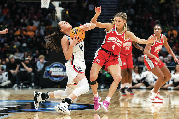 The third-seeded Buckeyes (28-7) forced No. 2 seed UConn (31-6) into 25 turnovers, ending the Huskies’ season before the national semifinals for the first time in 14 seasons. UConn hadn’t been eliminated this early since 2006.