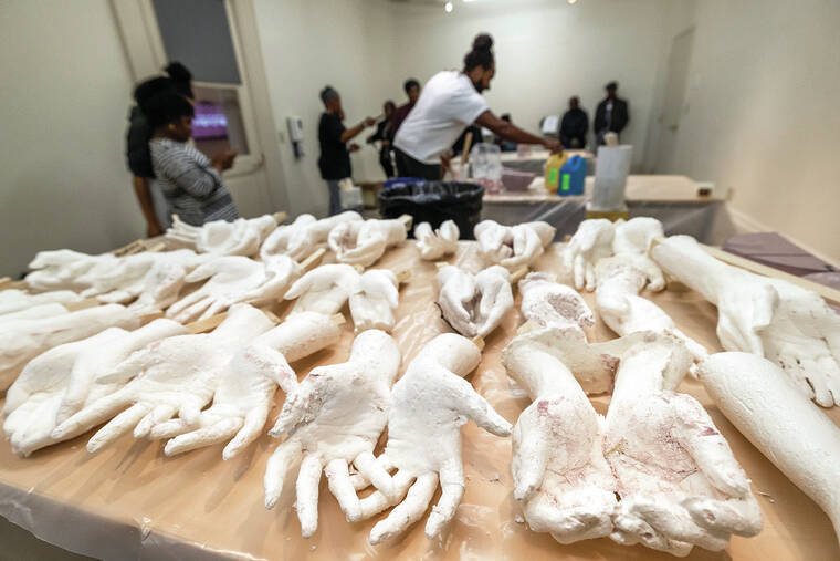 Cast hands made from local volunteers are displayed on a table in Charleston, S.C., Saturday, Feb. 18, 2023. Artist Stephen Hayes, background center, will use the molds to make a memorial for 36 enslaved people whose bodies were unearthed in Charleston in 2013 during a construction project for the Gaillard Center. (AP Photo/Mic Smith)