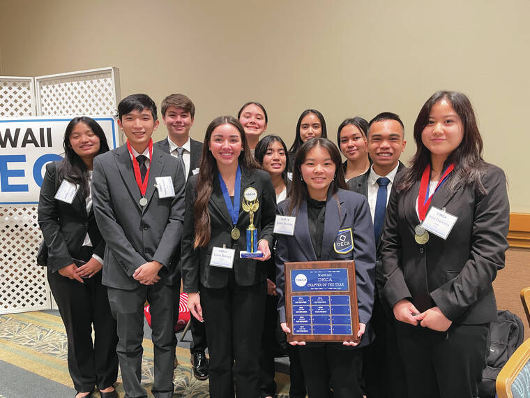 Waiakea High School DECA (Distributive Education Clubs of America) students excelled at the 2023 Hawaii State DECA Career Development Conference that took place on February 1-3 at the Ala Moana Hotel on Oahu. Waiakea DECA received recognition as DECA Chapter of the Year. President Jessie Shimizu represented her chapter’s officers and club members when accepting the award.