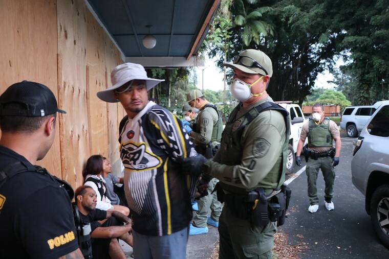 More than three dozen officers from the DLNR Division of Conservation and Resources Enforcement, the Hawaii Police Department and the State Sheriff Division teamed up to sweep the three-story building, which is condemned because of unsafe and unsanitary conditions.