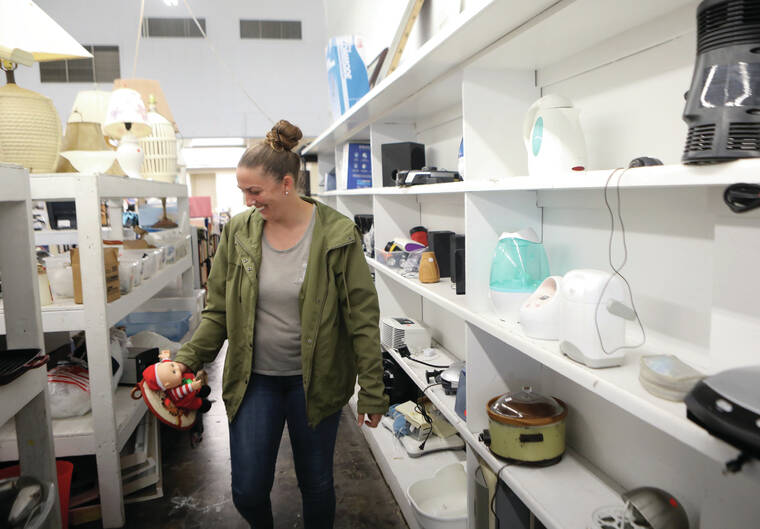 Kelsey Walling/Tribune-Herald Kaleina Hennessey puts items in a bag for customers while working at the Salvation Army Sally Shop thrift store in Hilo on Thursday, April 6, 2023.