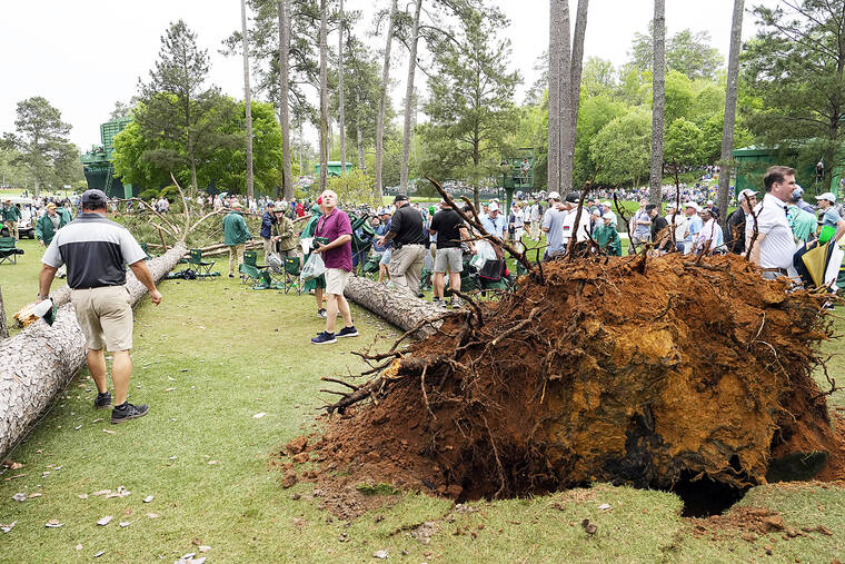 AUGUSTA, Ga. — Three towering pine trees fell near patrons as storms rolled through Augusta National on Friday, though nobody was hurt, and the second round of the Masters was suspended for the day amid heavy wind and rain.
