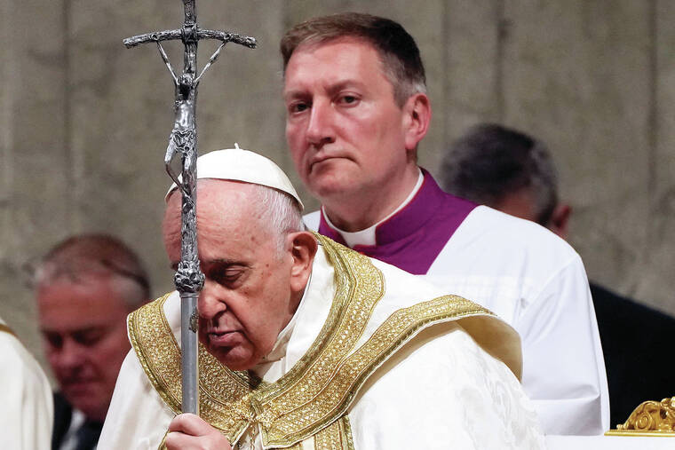 At the start of the Easter vigil, Francis, who arrived in a wheelchair he uses to cope with knee pain, incised in the wax of a tall candle a cross, the first and last letters of the Greek alphabet — alpha and omega — and the numerals of this year.