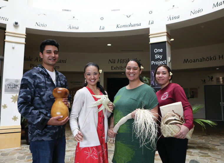 Kelsey Walling/Tribune-Herald 'Imiloa Astronomy Center program planners, from left, Kai Nohi, Kayla Asing, Ku'ulei Bezilla and Rayna Robinson pose with cultural items that will be utilized in the enrichment programs that will be ongoing during Merrie Monarch week.