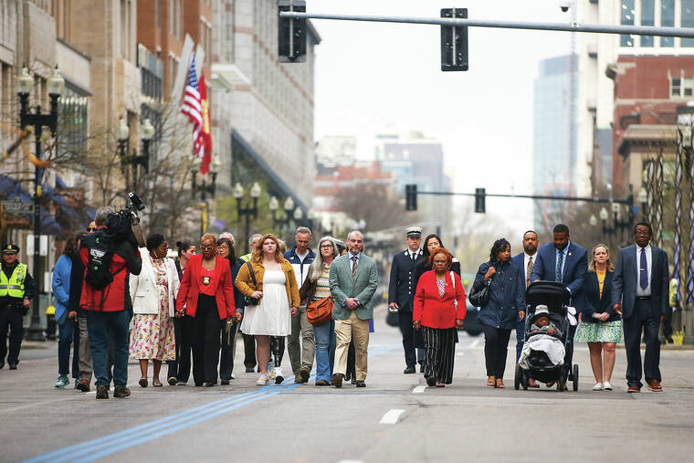 Boston Mayor Michelle Wu, who was making her first run for City Council when the bombing happened, joined the somber procession along with Gov. Maura Healey. At each memorial site — marked with three stone pillars — they stood with the families in silence.