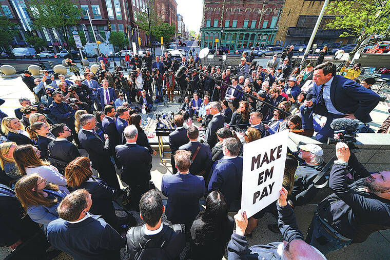 Reporters surround attorneys for Dominion Voting Systems during a news conference outside the New Castle County Courthouse in Wilmington, Del., after the defamation lawsuit by Dominion Voting Systems against Fox News was settled just as the jury trial was set to begin, Tuesday, April 18, 2023. (AP Photo/Julio Cortez)
