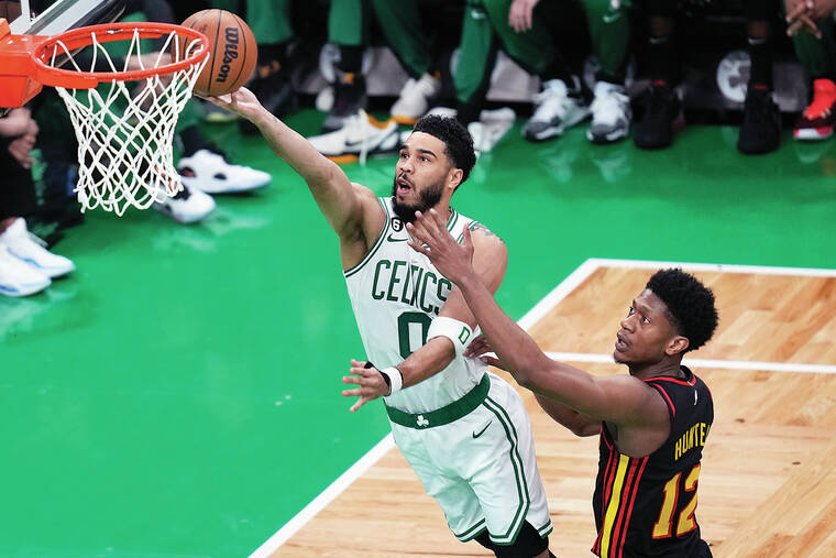The play ended a clinching late run and was the final basket of the night for Tatum and Boston beat Atlanta 119-106 on Tuesday night to take a 2-0 lead in the first-round playoff series.