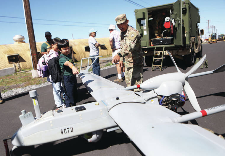 “The (UH-60 Black Hawk) helicopter you might recognize,” Cronin told a nearby crowd of students. “Whenever there’s a wildfire here in the community, those 60s come from Oahu, from the 25th Combat Aviation Brigade, and support our community and our installation with water bucket drops.”