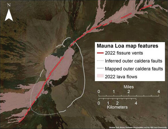 In total, 17 km (11 mi) of fissures spanned the uppermost SWRZ, the southern and central outer caldera, and the NERZ during the 2022 eruption of Mauna Loa.