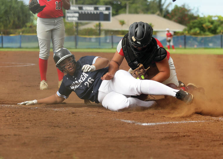Kelsey Walling/Tribune-Herald Waiakea first baseman Jayda Kaimi slides into home but is tagged out by Keaau catcher Jaime-Lynn Santos in Game 1 of the BIIF Division I Softball Semifinals.