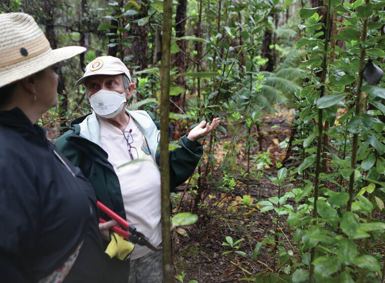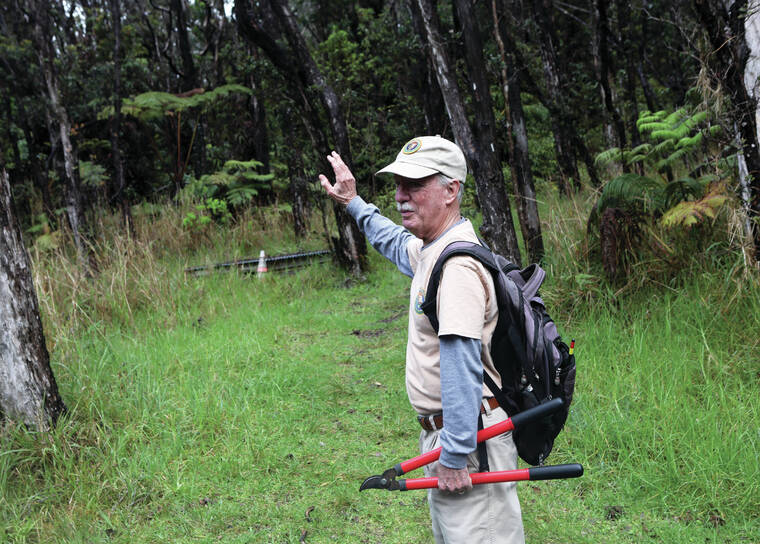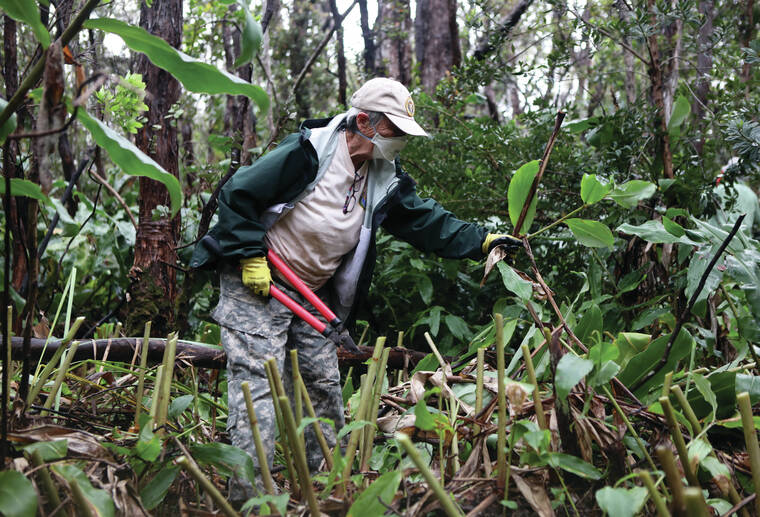 With the chirping songs of the oma‘o singing overhead, Jane, 80, and Paul Fields, 77, recently enjoyed another day of lopping ginger and learning about the forest in Hawaii Volcanoes National Park.