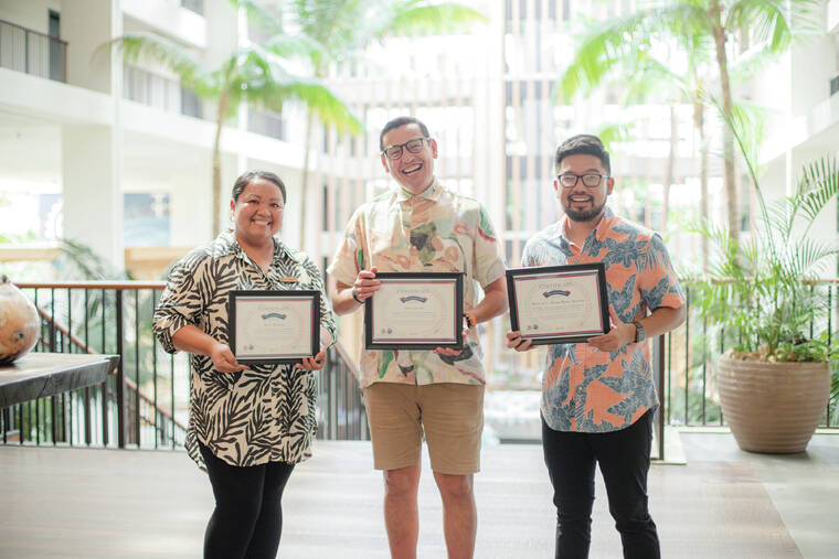 Photo courtesy of Dylan Andrion West Hawaii Filipino Chamber of Commerce President Dylan Andrion, right, and WHFCC Treasurer Apple Perreira, left, present certificates of membership for Mauna Lani Auberge Resorts Collection to Director of Operations Sergio Caceres, center, and General Manager Sanjiv Hulugalle, who is not pictured.