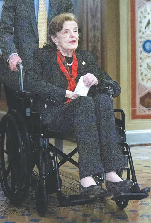 Looking noticeably thinner and frail, Feinstein is using a wheelchair to get around the Capitol as she continues to recover from a case of shingles. She missed the Senate’s first votes on Wednesday morning but arrived outside the Senate in a car for an afternoon vote, helped into the wheelchair by aides and greeted by Senate Majority Leader Chuck Schumer with a handshake and affectionate pat on the back.