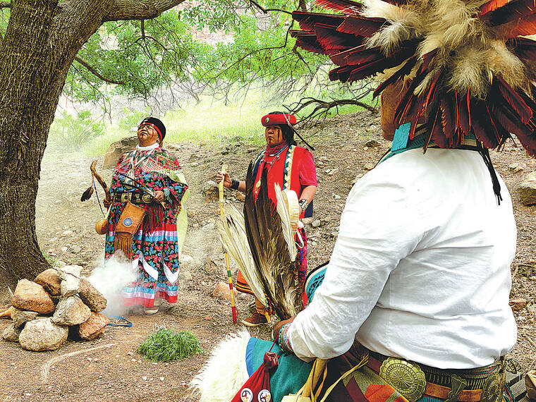 As the sage was lit, Uqualla placed red ochre and corn pollen in the fire. Tribal members guided the smoke using a bundle of feathers onto themselves as a blessing. They prayed and sang in Havasupai and in English. Before leaving, they placed a staff on a hillside to honor the spirits.