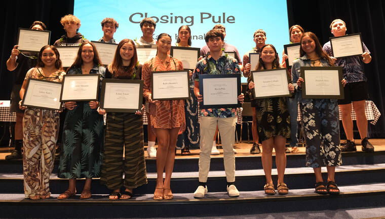 Connor Whitt/ Tribune-Herald College-comitted KSH senior athletes include, from left in the back row, Tobey Lau, Logan Enos, Ka‘olapa Masuko, Ezekiel-Aaron Gragas, Taina Kaauwai, Dylan Pires, Jadin Chaves, Kilinoelehua Helm and Dylan Hanson; front row, Leisey Keli‘i, Cammie Masanda, Lainey Eckart, Kale‘a Kuamo‘o, Rycen Pola, Savanna Colliado and Waiahuli Akau.