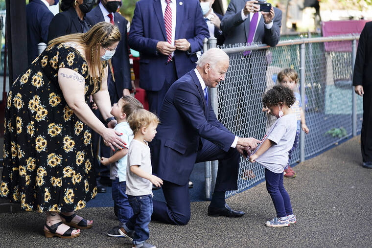 THE FACTS: The photo was digitally altered to make it appear as if Biden’s hands were under the child’s shirt. The original photo, which was taken by an AP photographer in 2021, shows the child stretching their shirt to show the president, who is pointing at the shirt in return. The altered photo, however, appears to show Biden kneeling in front of a child, with his hands underneath the kid’s gray shirt. The photo was shared on Instagram with a caption above the photo that reads, “This is what people ‘voted’ for?” The original photo was taken on Oct. 15, 2021, while Biden was visiting the Capitol Child Development Center in Hartford, Connecticut. In the original, the child is stretching their top to show the president, and Biden is pointing at the shirt. A comparison of the two images shows the version circulating on social media has been altered to move the child closer to Biden, and another child standing in the background against a fence has been edited out. A watermark faintly visible on the doctored photo is the name of a Twitter user who regularly posts altered videos that are satirical. They shared the altered image on Twitter in December 2022. C-SPAN also captured video of the moment the photo was taken, and confirms Biden never touched the child in the way the edited image suggests. The footage shows Biden talking to the children at the playground and later giving the child in the photo a hug.