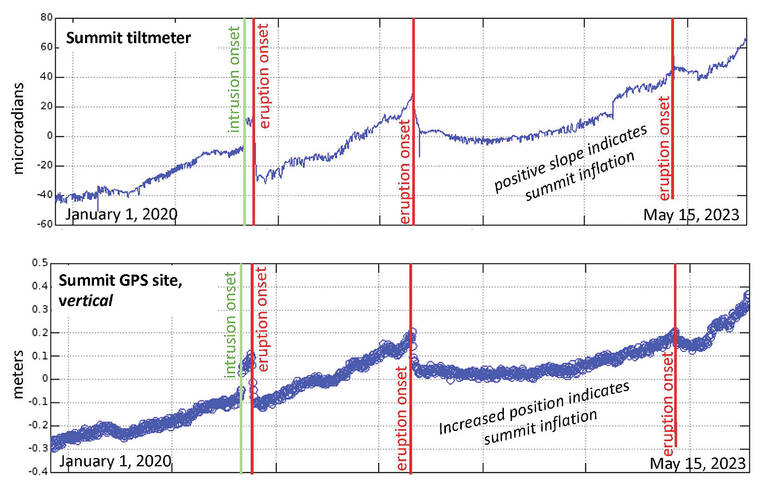 At Kilauea volcano, we are used to constant deformation and change. Following the large lower East Rift Zone eruption from May–August 2018, Kilauea began a period of calm during which HVO’s deformation instruments measured almost no significant surface movements. Then in March 2019, tiltmeters and GPS instruments started to measure uplift once again, indicating inflation of the summit.