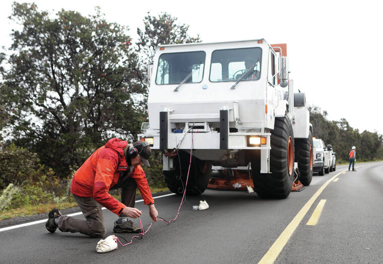 The truck is a seismic vibrator, or vibroseis, which is currently working to generate a high-resolution seismic map of the Kilauea caldera.