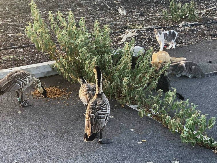 DLNR had ordered the shopping center property owner, Alexander &Baldwin to remove the three cat feeding stations in the parking lot, because the cat food was attracting nene, the Hawaiian goose — the state bird, which is listed as an endangered species by both the state and is listed as threatened by the federal government.