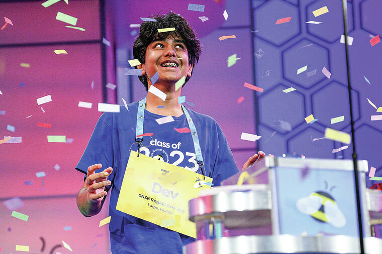 Dev got through his region. He flexed his knowledge in Wednesday’s early rounds by asking questions that proved he knew every relevant detail the bee’s pronouncers and judges had on their computer screens. And when it was all over, he held the trophy over his head as confetti fell.