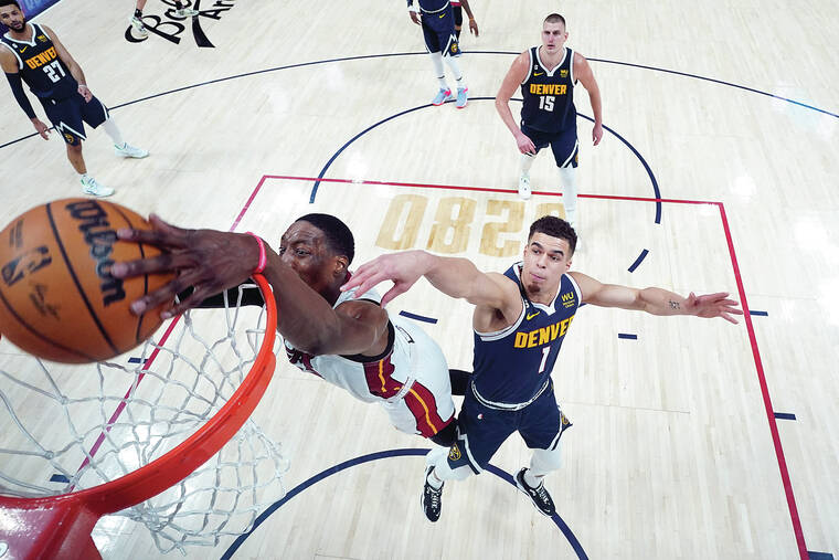 Max Strus scored 14 and Duncan Robinson had 10 — all of them in the fourth — for the Heat, who had a big early lead, then got down by as many as 15. They had no answers for Jokic, who was 16 of 28 from the floor, the last of those shots a 4-footer with 36 seconds left to get the Nuggets within three.