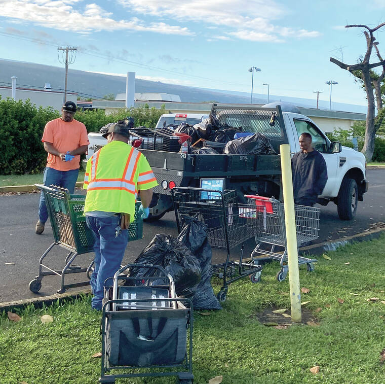 County workers remove trash from the area fronting Kona Aquatics Center after removing a homeless encampment. Courtesy photo/Special to West Hawaii Today