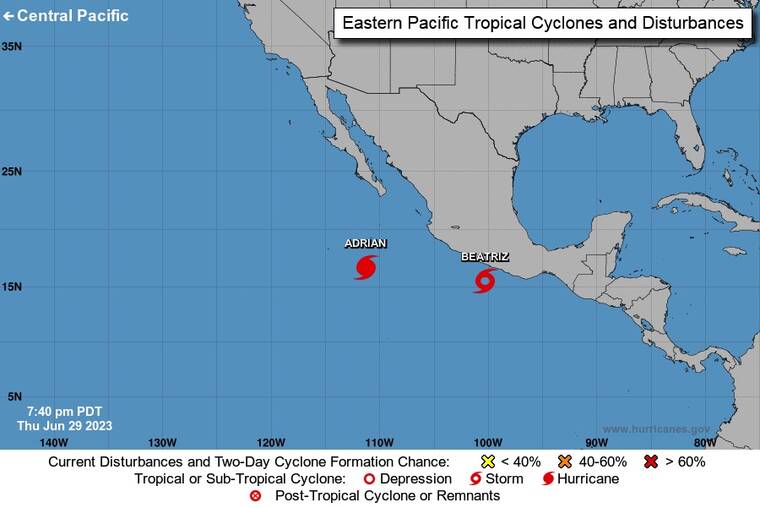 Beatriz is the second storm to be detected this season, following Hurricane Adrian, which was first detected west of Mexico on Tuesday and became a hurricane by Wednesday. As of Thursday afternoon, Adrian was generating sustained winds as high as 85 miles per hour, and was expected to travel west-by-northwest throughout the next several days, petering out into a tropical depression by Sunday evening.