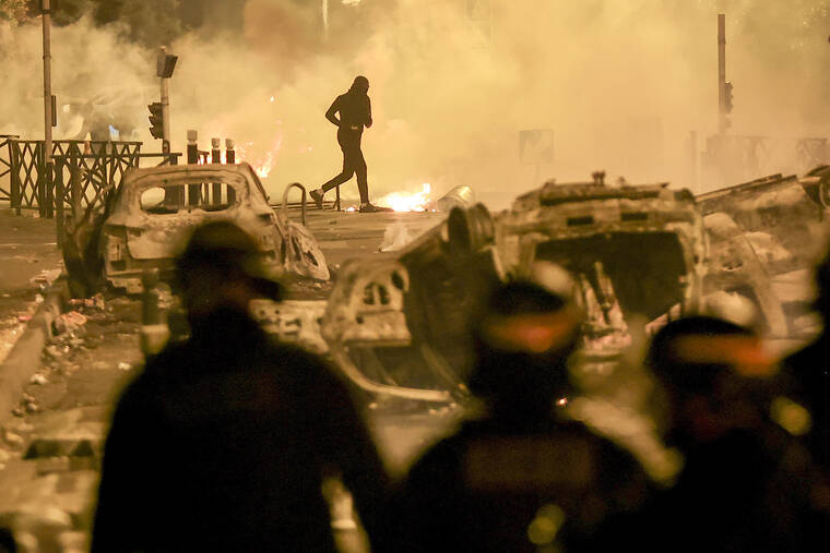 NANTERRE, France — Young rioters clashed with police and looted stores Friday in a fourth day of violence in France triggered by the deadly police shooting of a teen, piling more pressure on President Emmanuel Macron after he appealed to parents to keep children off the streets and blamed social media for fueling unrest.