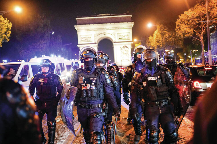 Near the Arc de Triomphe on Saturday night, hundreds of police with batons and shields stood restlessly along the Champs-Elysées, several in front of the shuttered Cartier boutique. Posts on social media called for protests on the grand boulevard but the police presence appeared to discourage any large gatherings.