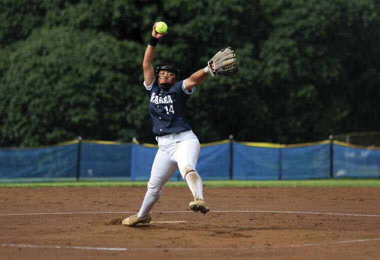 Kelsey Walling/Tribune-Herald File Photo Waiakea pitcher Kaylee Aiona pitches to Keaau during Game 1 of the BIIF Division I Softball Semifinals in April. Aiona was named BIIF DI Player of the Year.