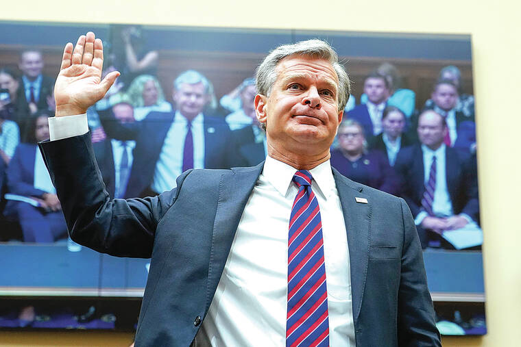 In testy exchanges with Republicans on the House Judiciary Committee, Wray rejected the GOP assertion that the bureau was favoring the Biden family and said the notion that the bureau was involved the Jan. 6, 2021, attack on the Capitol was “ludicrous.”