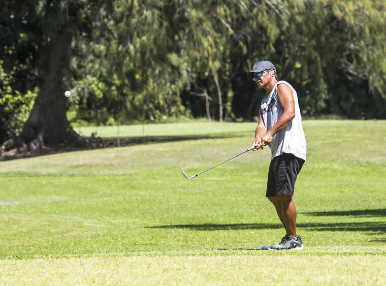 Kelsey Walling/Tribune-Herald Dominic Estrada practices chipping to the green while golfing Friday at the Naniloa Golf Course in Hilo.
