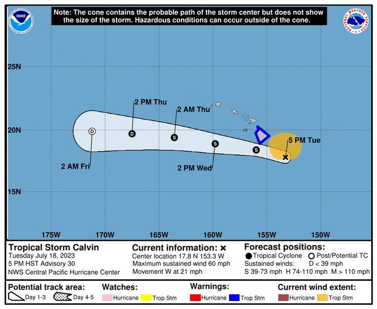 National Weather Service graphic This graphic shows Tropical Storm Calvin's trajectory through Hawaii's islands through Friday morning.