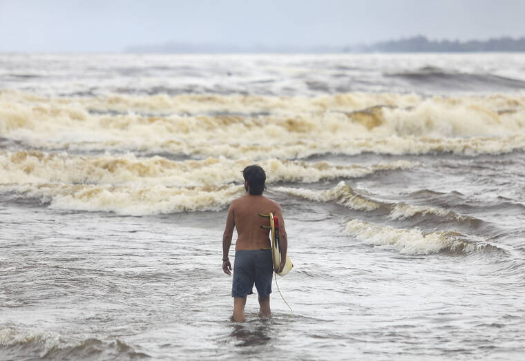 “Other than the river, it looks good. We got big waves out there,” Oda said, gesturing to a handful of surfers bobbing amid the crashing waves.
