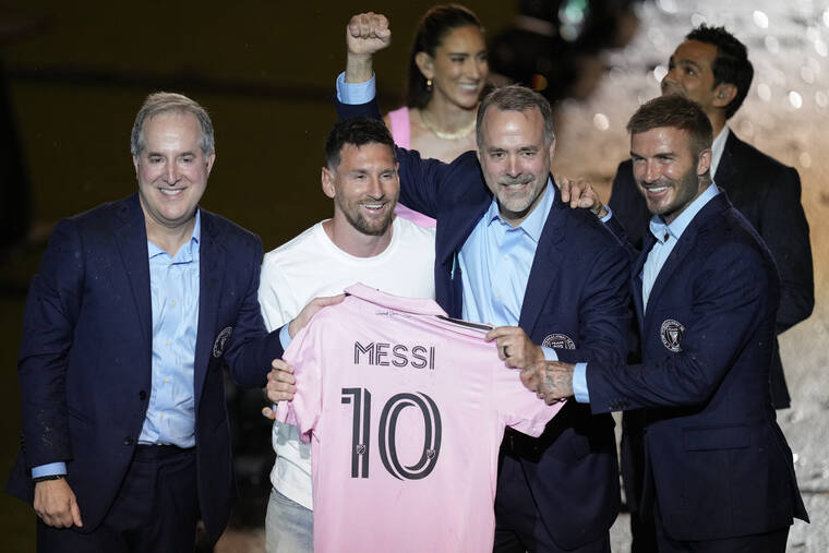Inter Miami's Lionel Messi, center left, holds his new Inter Miami team jersey as he poses with team co-owners Jorge Mas, left, Jose Mas, second right, and David Beckham during a celebration by the team at DRV PNK Stadium, Sunday, July 16, 2023, in Fort Lauderdale, Fla. It comes one day after Messi, Major League Soccer and Inter Miami finalized his signing through the 2025 season. His first official training session is Tuesday and he is expected to play Friday in a Leagues Cup match against Cruz Azul. (AP Photo/Rebecca Blackwell)
