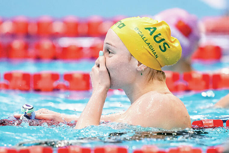 FUKUOKA, Japan — Australian swimmer Mollie O’Callaghan picked up a knee injury about five weeks ago, described as anything from a dislocation to a simple tweak. She said it slowed her some in practice, and modified her training schedule.