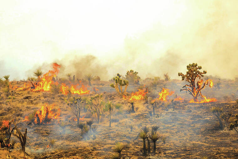 Wind-driven flames 20 feet (6 meters) high in some spots charred tens of thousands of acres of blackbrush scrub, pinyon-juniper woodlands and the famous Joshua trees in the New York Mountains in San Bernardino County.