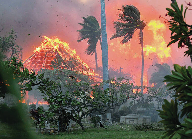 A massive wind-swept wildfire swept through Lahaina town Tuesday, forcing large-scale evacuations, burning homes and businesses, and leading to the rescue of a dozen people who fled into the ocean to escape the flames and heavy smoke that has destroyed much of historic Front Street.