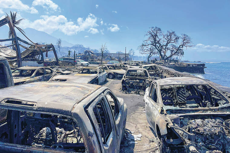 A flyover of historic Lahaina showed entire neighborhoods that had been a vibrant vision of color and island life reduced to gray ash. Block after block was nothing but rubble and blackened foundations, including along famous Front Street, where tourists shopped and dined just days ago. Boats in the harbor were scorched, and smoke hovered over the town, which dates to the 1700s and is the biggest community on the island’s west side.