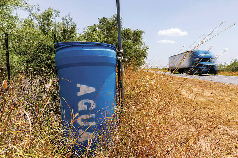 Wildfires are common in this part of Texas, where dry grass quickly becomes fuel. Road construction crews frequently push or move aside obstructions for their work. But as Garza, the sheriff’s investigator, walked along a path designated by GPS coordinates for the barrels, there were no signs of melted, blue plastic. And nothing indicated the heavy barrels had been moved. Though volunteers fill them only partway, they can weigh up to about 85 pounds (38 kilograms).