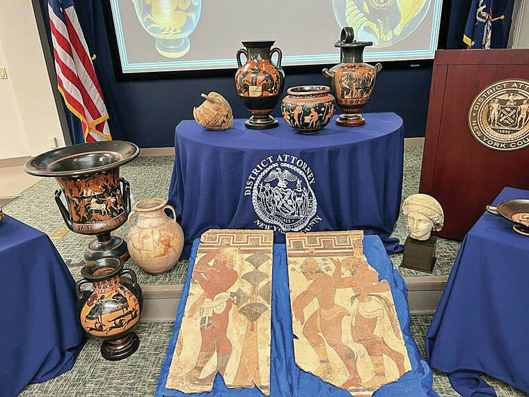 Bragg’s office said they included an Apulian krater, or vase, dating from 335 B.C. that was seized in July from a private collection in New York.