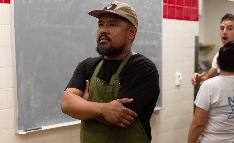 Photo by Brendan Smith Hilo-born, Maui-based Chef Sheldon Simeon, center, in ball cap, prepares food for residents impacted by the Maui fires.